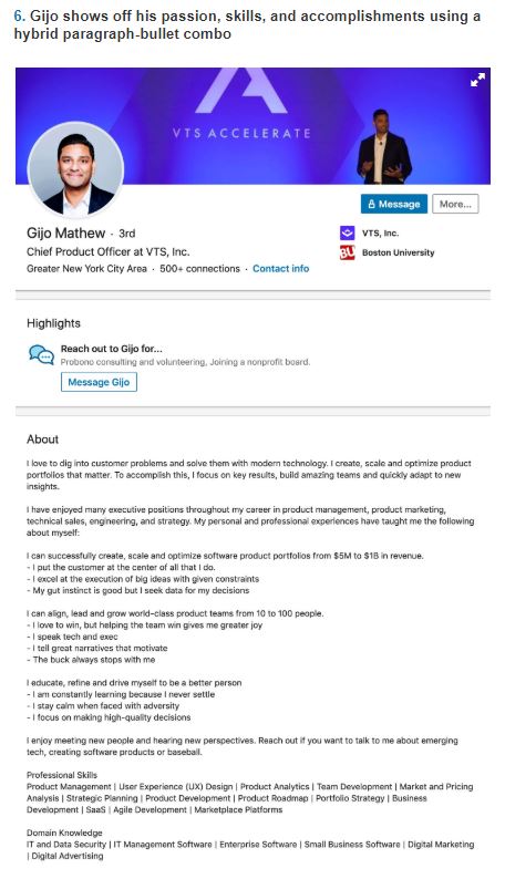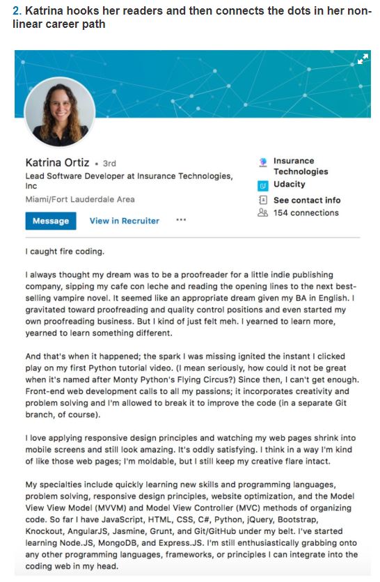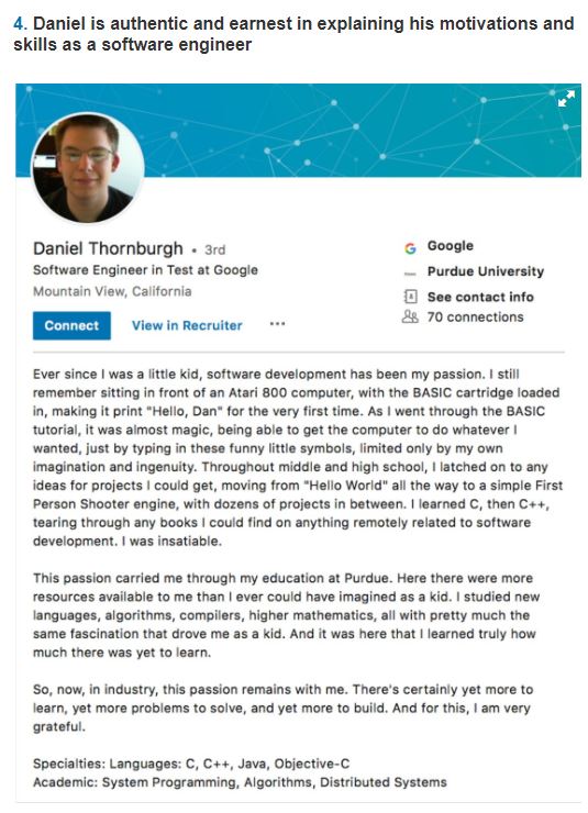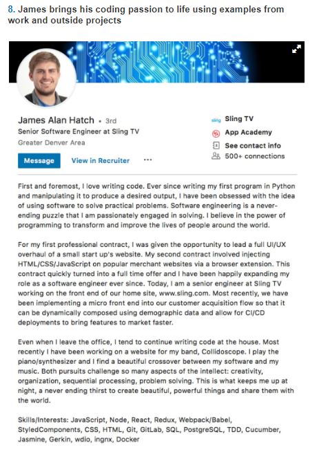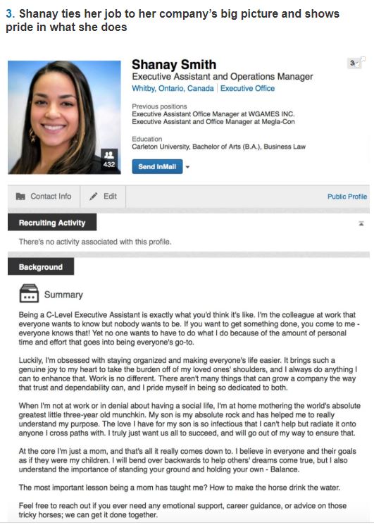 不只包含您現職的公司名稱和職位,檔案摘要應包含您職涯的歷程,招募者和潛在雇主想了解您轉換職務的原因以及您的職涯計畫,以便判斷您是否適合它們的公司。