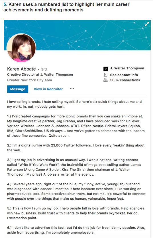 在檔案摘要置入您最重要的成就,雖然關於成就的細節應該被置入工作經驗(Work Experience)欄位,但是,在檔案摘要中置入最大且與職涯最相關的成就,可有助於您吸引讀者的注意。