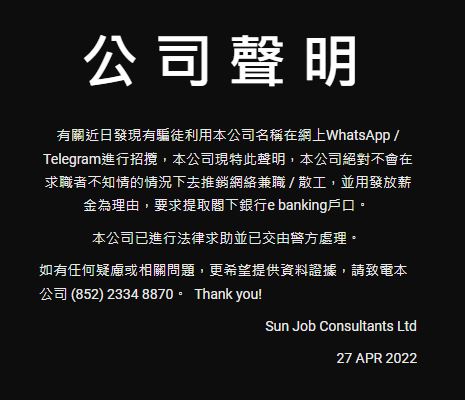 有關近日發現有騙徒利用本公司名稱去網上whatsapp / Telegram招攬, 本公司現特此聲明, 本公司絕對不會在求職者不知情的情況下去推銷網絡兼職 / 散工, 並用發放薪金為理由, 要求提取閣下銀行e banking戶口, 本公司以進行法律求助並已交由警方處理!